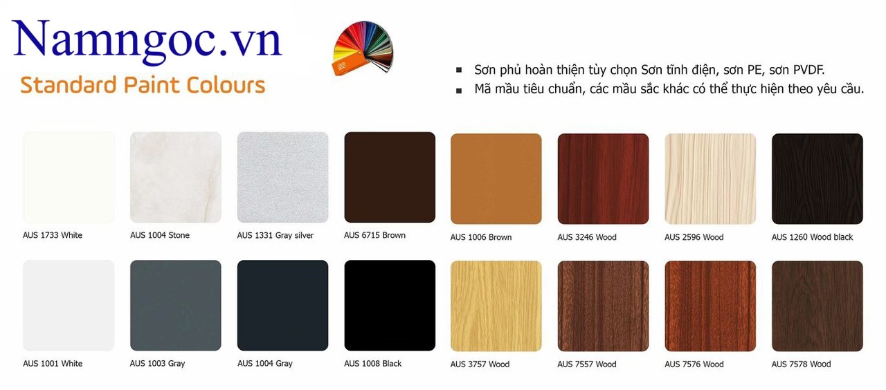 Sau đây là bảng màu tùy trọn trần caro. Ngoài phân phối thi công các loại trần nhôm, Nam Ngọc còn nhận thi công nội thất trọn gói với đội ngũ kỹ thuật chất lượng cao, đạp ứng những khách hàng khó tính nhất